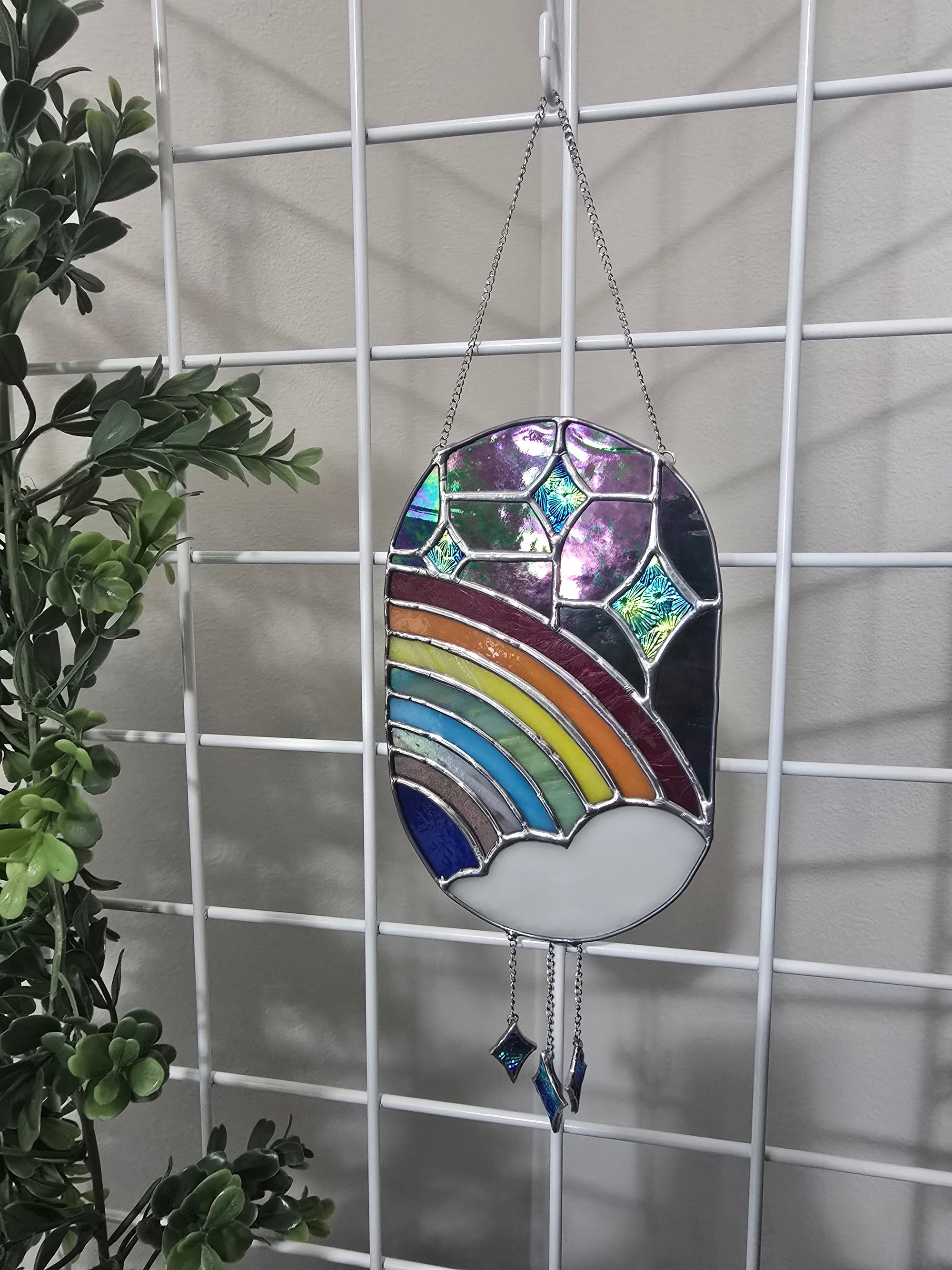This dreamy stained glass suncatcher features a cascading rainbow tucked into a soft white cloud, framed by a magical purple sky with shimmering iridescent accents and textured star-like gems. Three dangling glass diamonds catch the light and dance below, adding movement and sparkle. Hang it in a sunny window to bring a colorful moment of joy to any room.